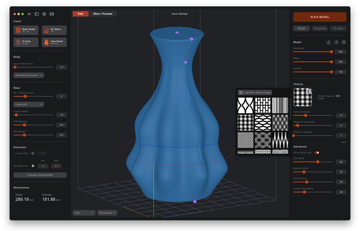 Add real, physical texture to your pieces — not just a visual preview. Clay Slicer 3 can take a 2D image and turn it into a 3D displacement directly on your vase. You can emboss, carve, repeat patterns and fade them in and out. Everything updates instantly as you tweak settings, so you see exactly what you’ll print. It’s the easiest (and most fun) way to create complex surfaces without needing any modeling software.